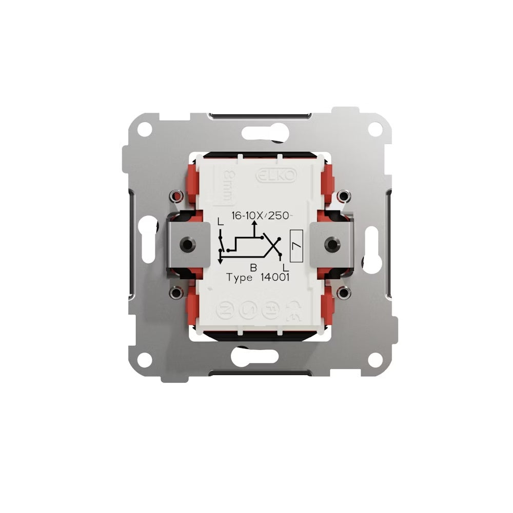 Kytkimessä on ruuviliittimet, joissa on johtimen sisäänkäynti sivulla. Sen nimellisjännite on 250 V AC. Sen nimellisvirta on 16 A. Uppoasennuksessa kojerasiaan voidaan tarvittaessa lisätä kiinnitys kiinnityspakkauksella. Kytkimen voi muuntaa painikkeeksi lisäämällä impulssijousi. ELKO-kytkimissä tämä on erityisen yksinkertaista, koska impulssijousta ei tarvitse ujuttaa kytkinkojeeseen, vaan jokaisessa vivussa on kaksi paikkaa impulssijouselle, vivun ylä- ja alaosassa. Sen nimellisjännite on 250 V AC ja nimellisvirta 16 A. Tuotteen mitat ovat (W) 71 mm x (K) 71 mm x (S) 30 mm. Se on valmistettu kierrätetystä polykarbonaatista (PC). Tuotteen väri on musta (RAL 9005) ja se on mattapintainen. Se saavuttaa IP21-suojaustason IK07-iskulujuudella.