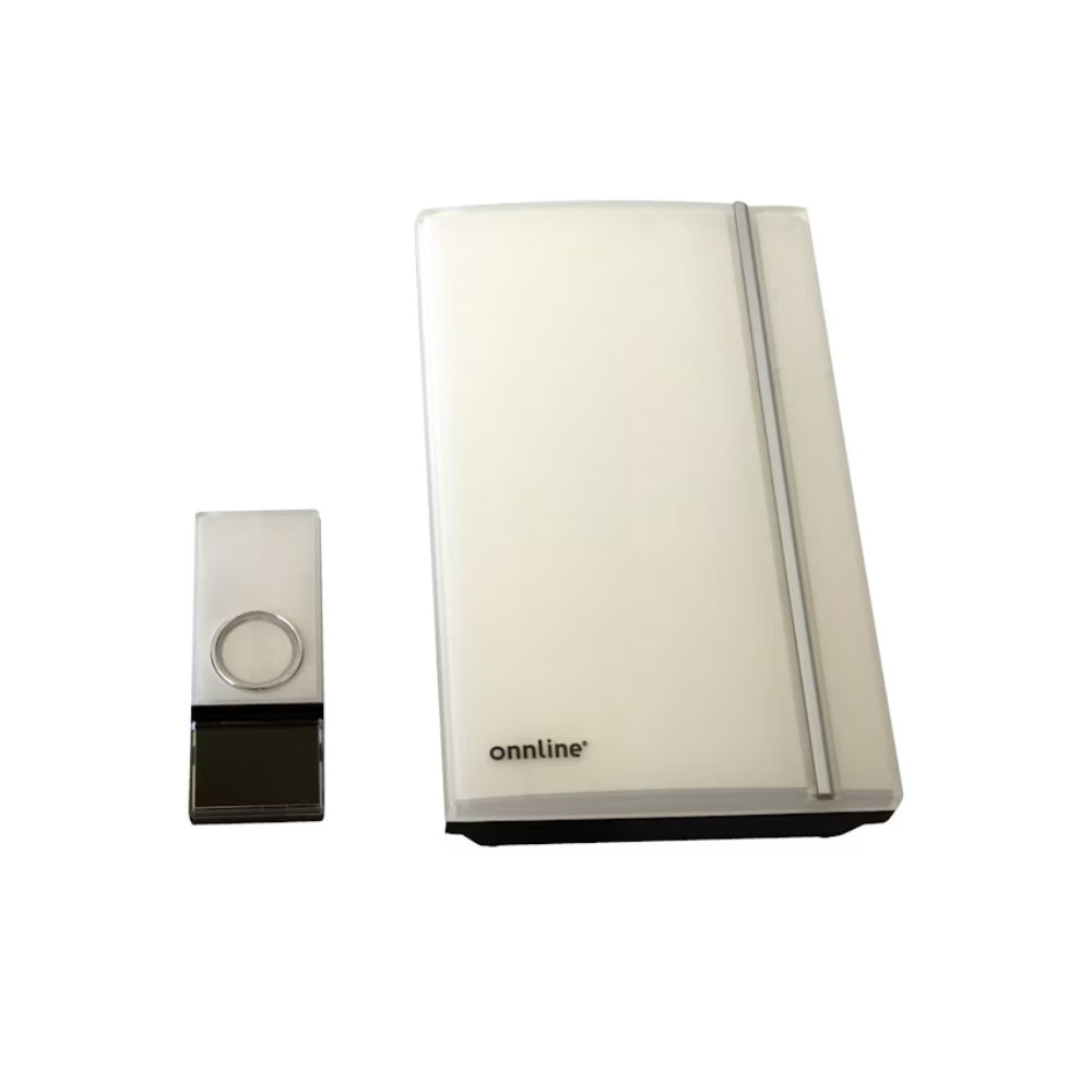 Langaton ovikello ja painike AHC000, valkoinen. 32 soittoääntä, joista 24 polyfonisia. Lähettimessä ja vastaanottimessa LED-valo. Vesitiivis lähetin toimii yhdellä 12 V:n 23A-paristolla (sisältyy toimitukseen) ja vastaanotin kolmella 1,5 V:n AA-paristolla (eivät sisälly toimitukseen). Kantama 100 m(avoin alue).