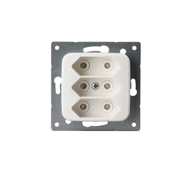 2,5A/250V. 3-osainen Euro pistorasia keskiölevyllä. Pistorasiassa on liittimet 0- ja N-johtimille ja niihin voi kytkeä max 4 johtoa (haaroitusmahdollisuus). Lisäksi rungossa on 2-lisäliitintä joihin voi kytkeä kumpaankin 2 johtoa. Liittimet on hyväksytty ML ja MK johtimille. Pistorasian runko on kosketussuojainen ilman peitelevyä. Uppoasennus sileälle pinnalle IP21.