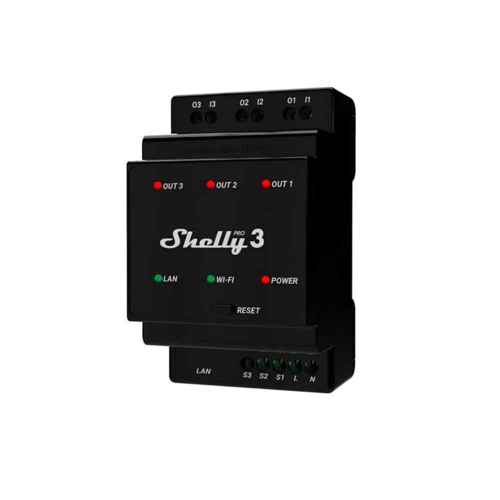 Shelly Pro 3 ohjelmoitava DIN-kiskorele, 3x16A, WiFi, LAN, Bluetooth