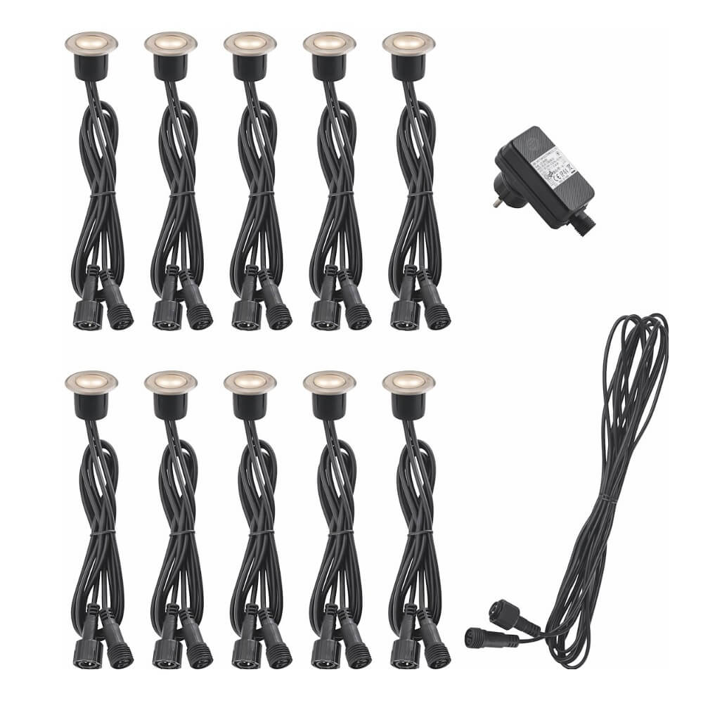 Laadukas terassivalosarja joka sisältää kaiken tarvittavan. Terassivalosarja sisältää kymmenen 0,2W tehoista ja 37mm halkaisijaltaan olevaa terassivaloa. Valoissa on kaksi kappaletta 75cm pitkiä liitosjohtoja joiden avulla valaisimet voidaan ketjuttaa toisiinsa. Valot liitetään mukana tulevaan pistotulppaliitäntäiseen virtalähteeseen pakkauksessa mukana tulevalla 5m pitkällä liitoskaapelilla.