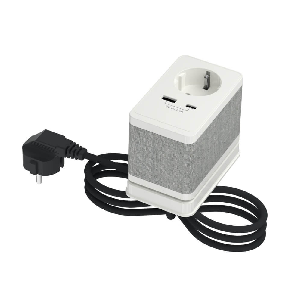 Pistorasian runko on muovia ja sen kyljet on viimeistelty tyylikkäällä Kvadrat-kankaalla.
